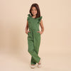 Macacão com babadinho na manga, bolsinho na frente, fechamento por zíper nas costas.