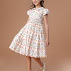 A gola tem um charmoso estilo Peter Pan, trazendo um toque de delicadeza ao visual. As manguinhas são no estilo princesa, deixando os ombros da criança à mostra e acrescentando um ar ainda mais encantador ao vestido.