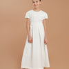 O Vestido Infantil Sonho, delicado vestido, com pregas na saia, manga curta e decote redondo. Faixa na cintura para dar o laço nas costas, fechamento por zíper invisível nas costas.