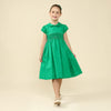 A golinha Peter Pan adiciona um toque clássico e encantador ao vestido, enquanto a saia evasê rodada traz movimento e delicadeza. Na altura da cintura, há uma faixa com laço ajustadora nas costas, permitindo que a peça se adapte perfeitamente ao corpo da criança.